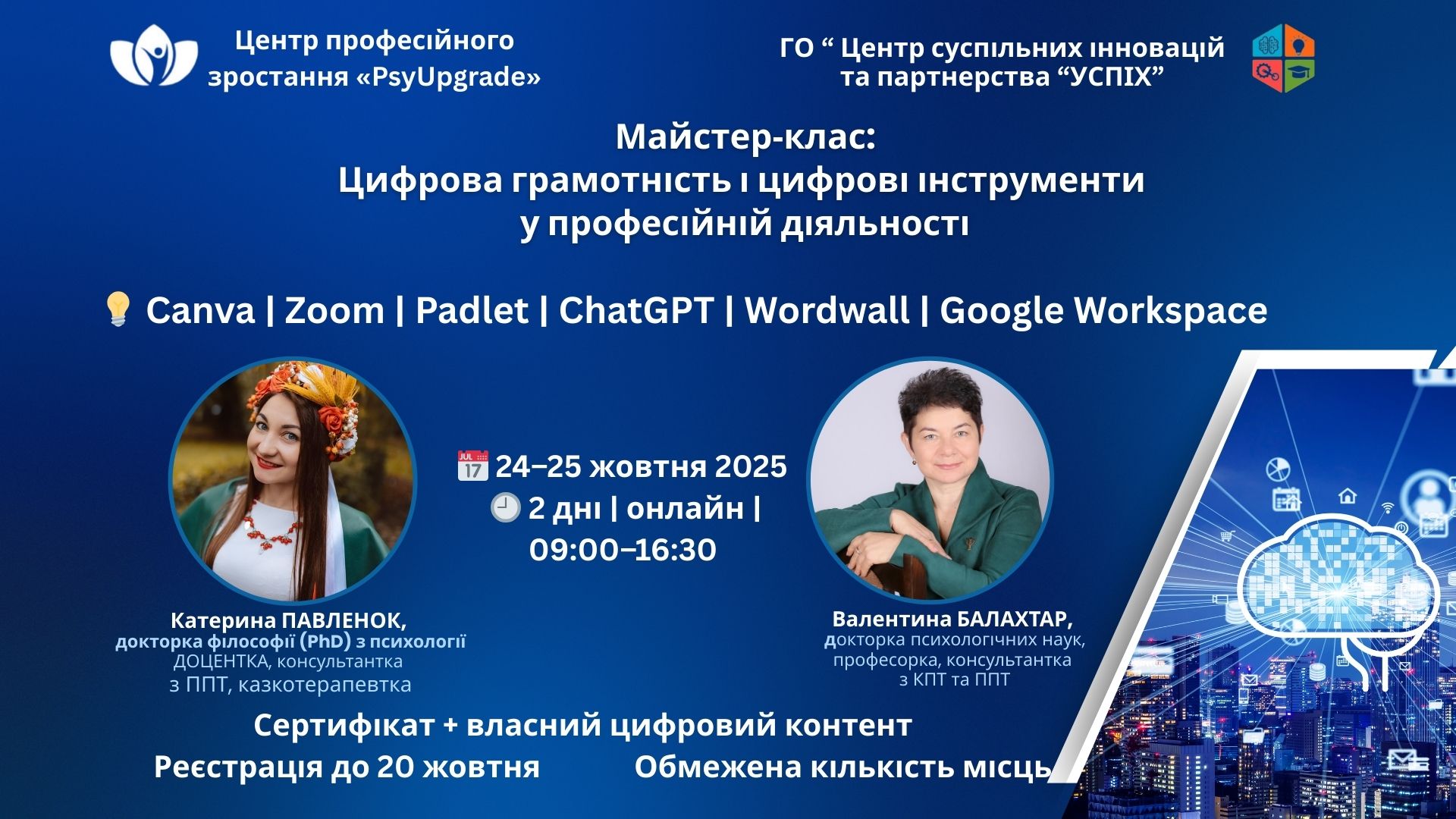 Запрошуємо на практичний дводенний майстер‑клас, де ви інтегруєте Zoom, Canva, Mentimeter, ChatGPT, Padlet, Google Workspace, Wordwall — у свою професійну діяльність.